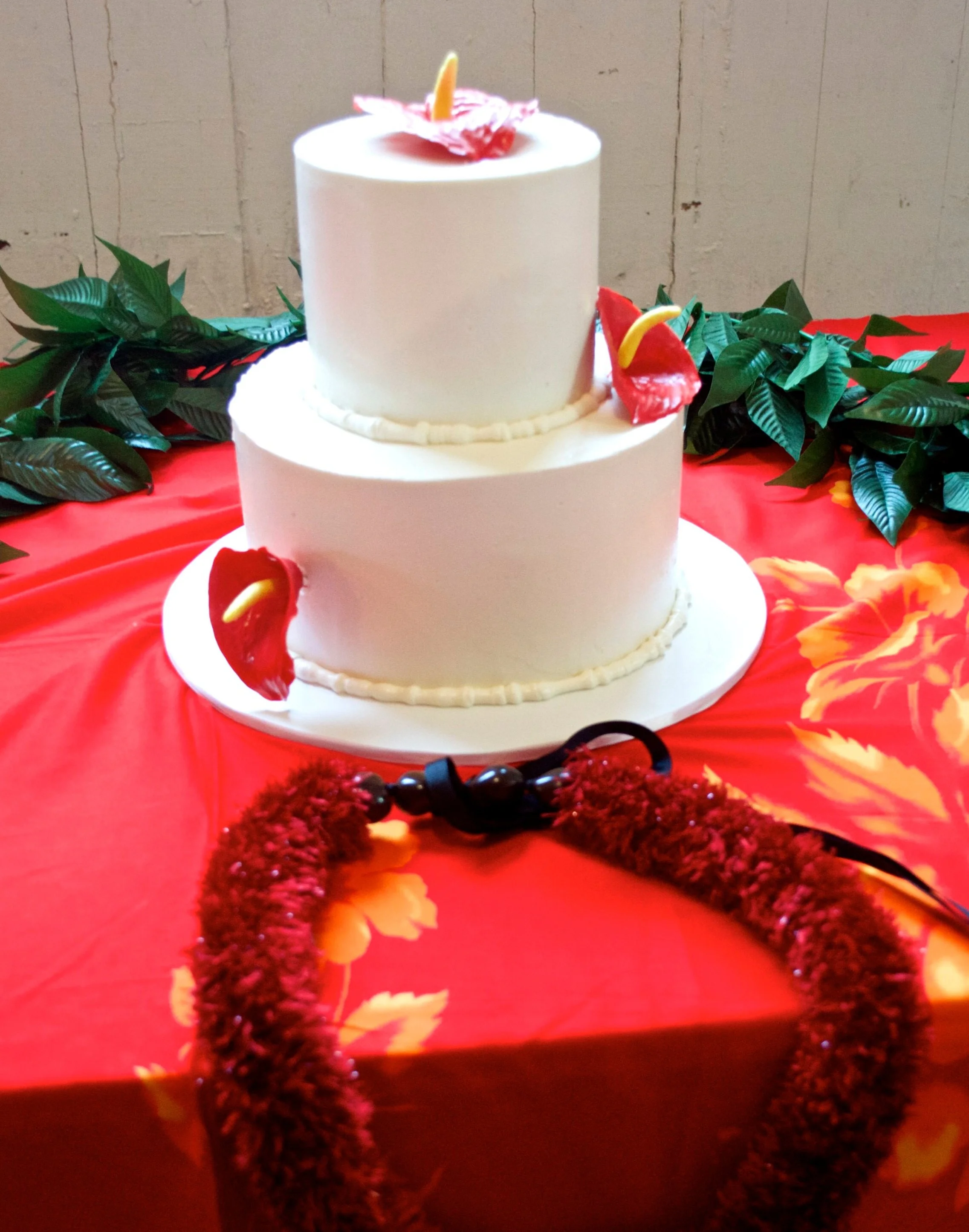 Wedding cake with anthurium blooms (Photo: Emily Kawahigashi)